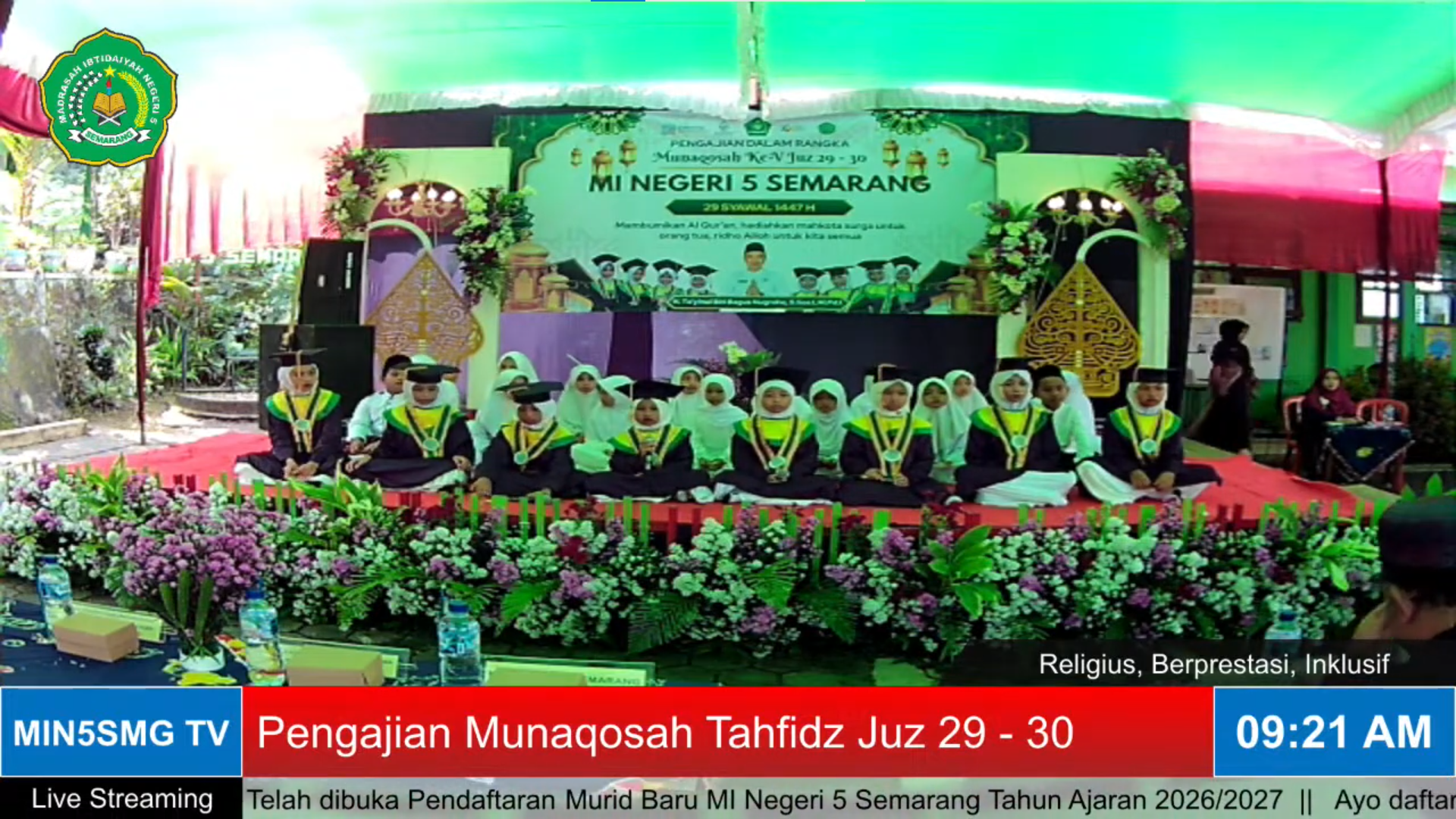JAMBU – Halaman MI Negeri 5 Semarang tampak dipenuhi oleh wali murid dan tamu undangan pada Sabtu (18/04/2026). Bertepatan dengan tanggal 29 Syawal 1447 Hijriyah, madrasah menggelar Pengajian Munaqosah Tahfidz Qur'an ke-V untuk kategori Juz 29 dan 30.
